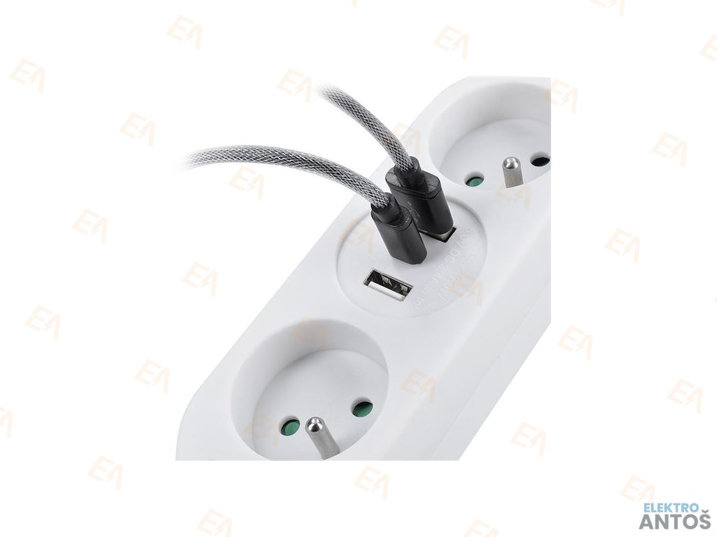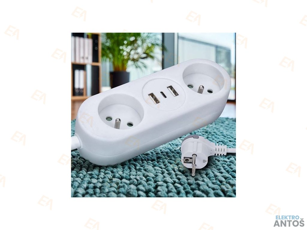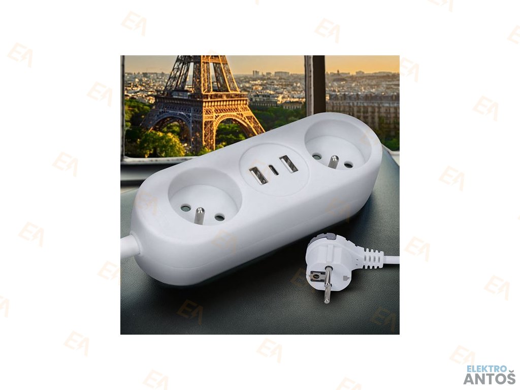 Predlžovací napájací kábel s dvoma zásuvkami a USB nabíjačkou. Skladný, výkonný, ľahko prenosný. Ideálny na nabíjanie elektronických zariadení na cestách.