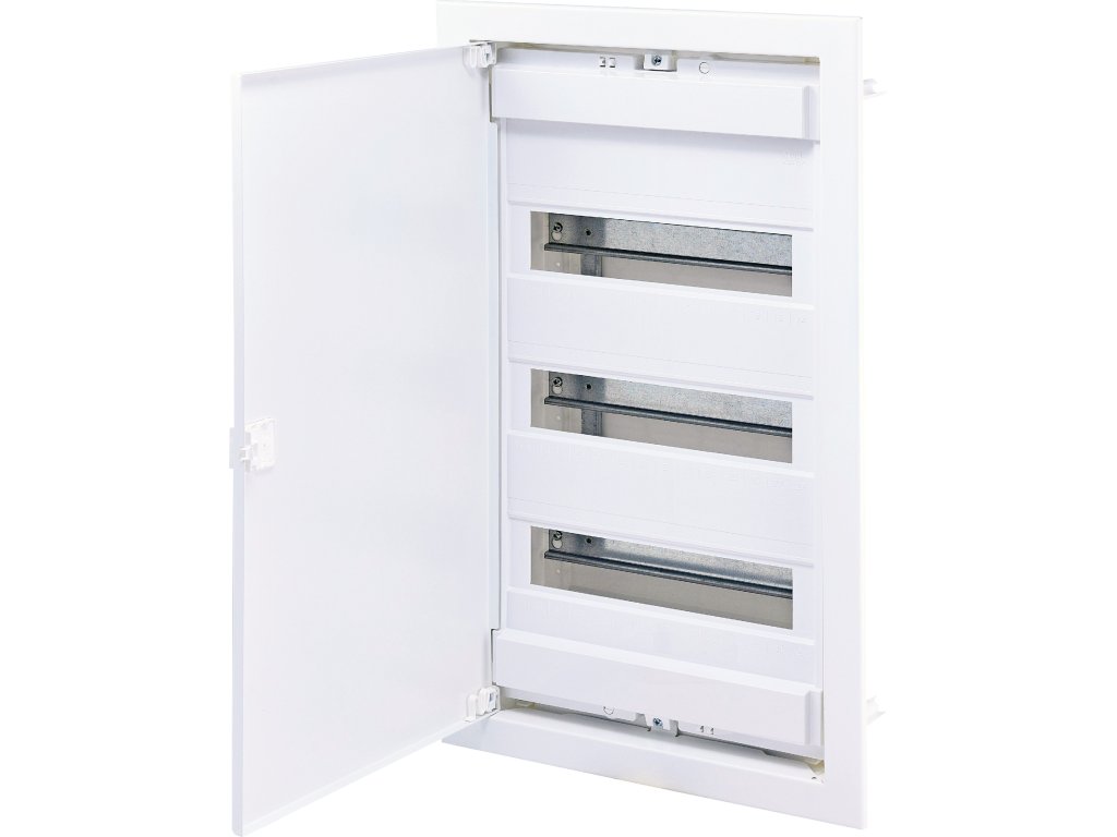 - Montáž pod omietku/do sadrokartónu: 3-radová robustná bezpečnostná schránka pre 42 modulov s bielymi dverami na ochranu vedenia a rozdelenia v bytoch a obytných domoch.