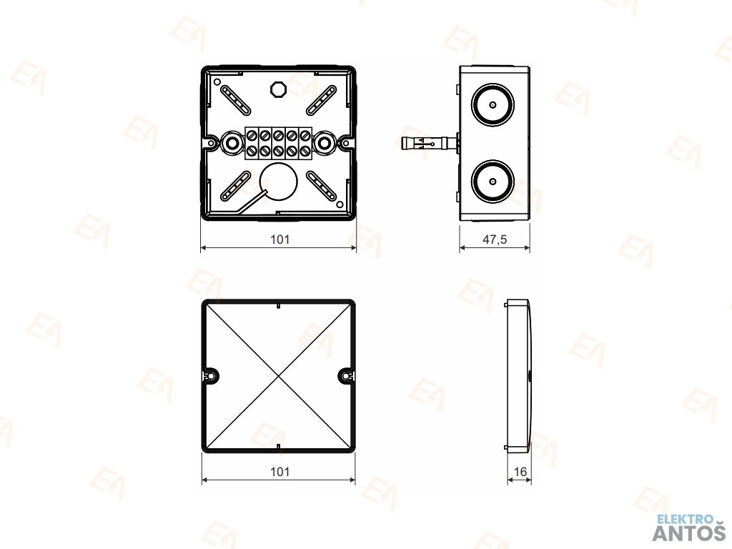 - Krabica je vybavená priechodkami z mäkčeného materiálu pre jednoduché zavedenie káblov a veko sa fixuje pomocou nerezových skrutiek (súčasť balenia). Inštalácia je možná vďaka priloženým kotvám do betónu.