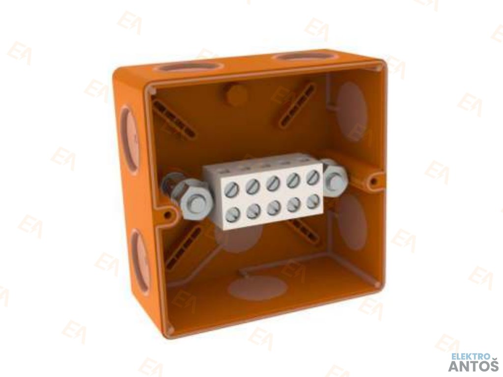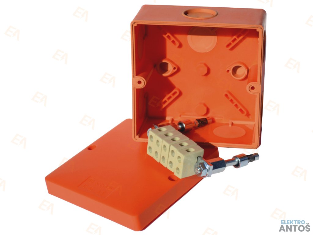 - Požiarne odolná elektroinštalačná krabica je vyrobená z bezhalogénového materiálu a je vybavená keramickou svorkovnicou s 5 pólmi, ktorá zachováva funkčnosť pri požiari. Svorky sú určené pre pripojenie 5 vodičov s prierezom od 1,5 do 6 mm².
