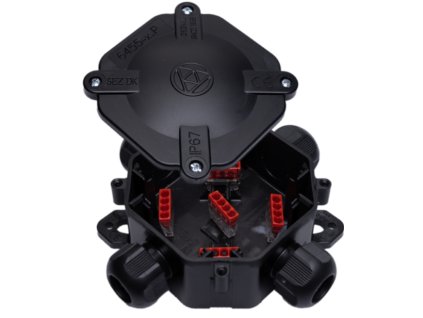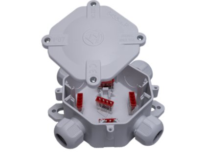 Elektroinštalačná vodotesná IP67 krabica na povrch so 4 prívodmi a 5ks wago svorkami.