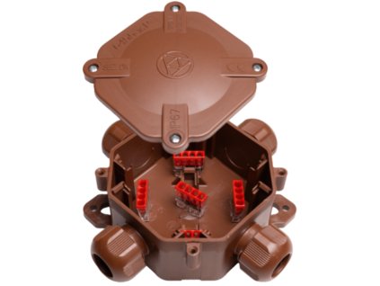 Hnedá elektroinštalačná vodotesná IP67 krabica na povrch so 4 prívodmi a 5-pólovou svorkovnicou 3P+N+PE.
