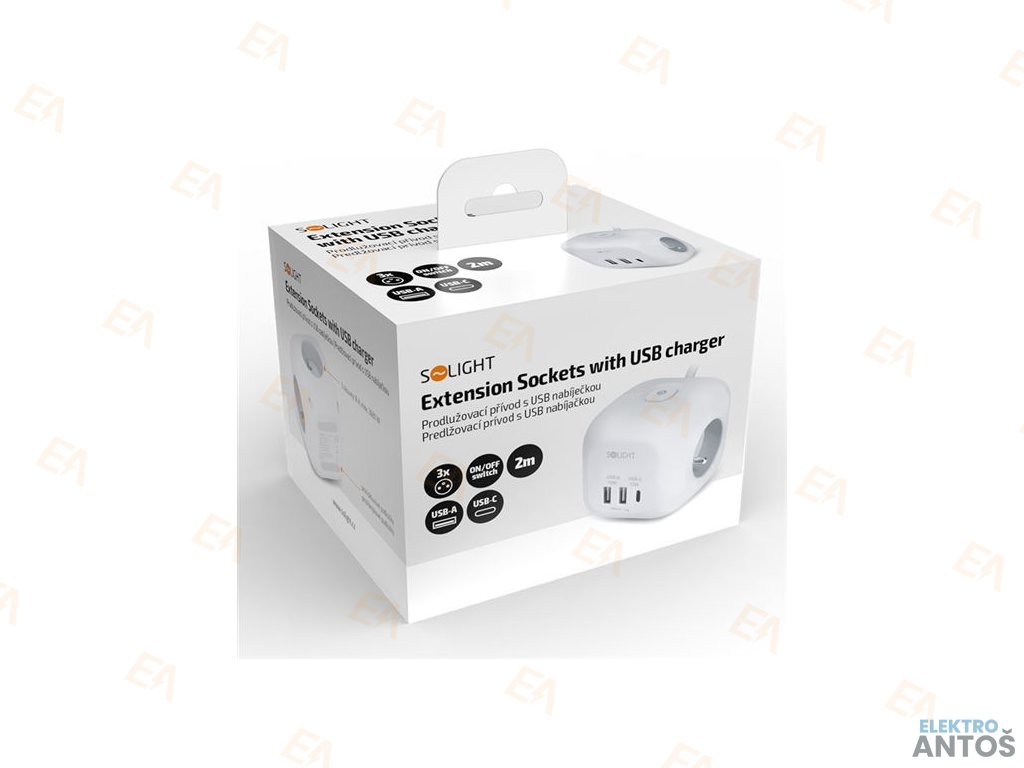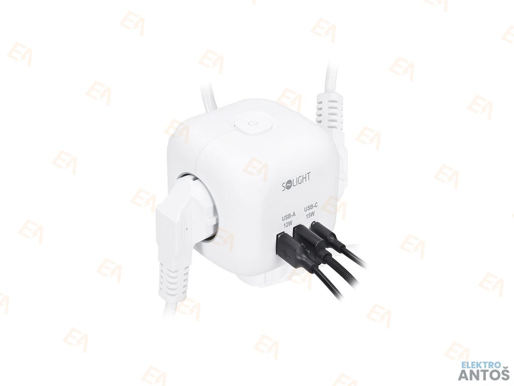 Predlžovací kábel kocka 3-zásuvka + 2xUSB-A +1xUSB-C 2 metre biela s vypínačom PP145C SOLIGHT