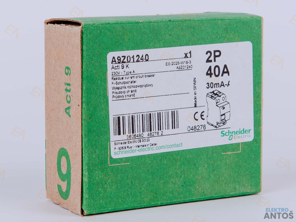 Prúdový chránič 2P 40A 30mA 6kA A A9Z01240 SCHNEIDER