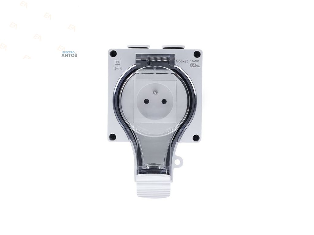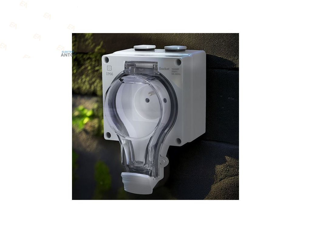 Vonkajšia zásuvka s priehľadným vekom a krytím IP66 ponúka maximálnu bezpečnosť v náročných podmienkach. Je plne chránená proti prachu, tryskajúcej vode zo všetkých smerov a úrazom elektrickým šokom pri kontakte s nástrojmi či drôtmi väčšími ako 1 mm. Vďaka tomuto vysokému stupňu ochrany je ideálny na použitie v priemyselnom aj domácom prostredí, a to aj vo vlhkých alebo prašných podmienkach.